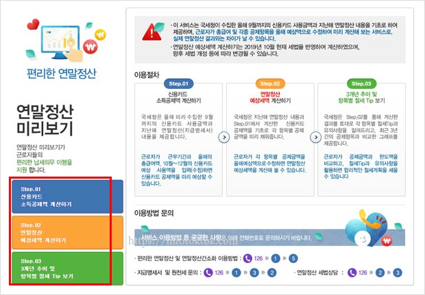 왼쪽 하단 Step.01 신용카드 소득공제액 계산하기를 클릭합니다.