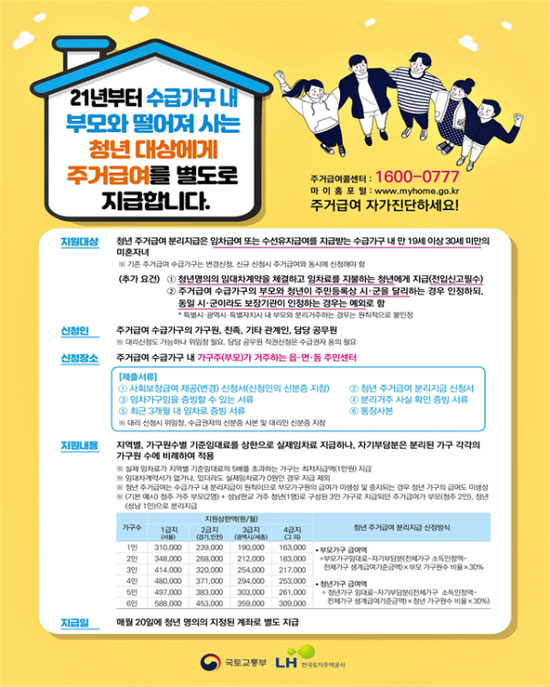 그동안 30세 미만의 미혼 자녀는 부모와 생계나 주거를 분리하더라도 동일 가구로 인정되어 별도로 주거급여 지원을 받을 수 없었는데요. 하지만 내년부터 청년 주거급여 분리지급 제도가 시행되어 주거급여 신청이 가능해진다고 해요. 청년 주거급여 분리지급 제도를 통해 저소득층 청년이 안정적이 미래와 자립 기반을 마련할 수 있도록 지원을 확대한 것이죠.