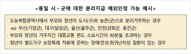 ▶ 취학이나 구직을 목적으로 불가피하게 부모와 떨어져 거주하는 청년의 주거안정 지원을 위한다는 당초 제도 도입 취지를 고려해 신청서 접수와 확인조사 단계에서 분리거주사유와 임차료 계좌입금 사실을 확인하여 적정 수급관리를 강화할 계획이라고 해요