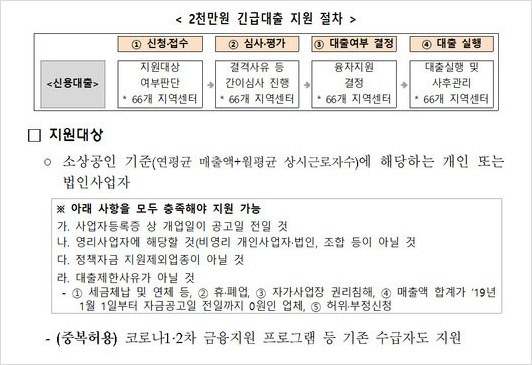 참고로 2천만원 긴급대출 한도 운영방법에 대해 알아보면 업체 당 대출금액은 매출액, 대출 제한사유 등을 종합적으로 검토하여 대출한도 범위 내에서 산출하므로, 대출심사 결과에 따라 대출 지원이 어렵거나 신청금액 중 일부가 감액될 수 있다고 해요.
