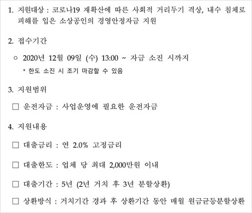 ▶ 접수기간: 2020년 12월 9일(수) 13시부터 ~ 자금 소진 시까지인데요. 한도 소진 시 조기 마감될 수 있다고 합니다.