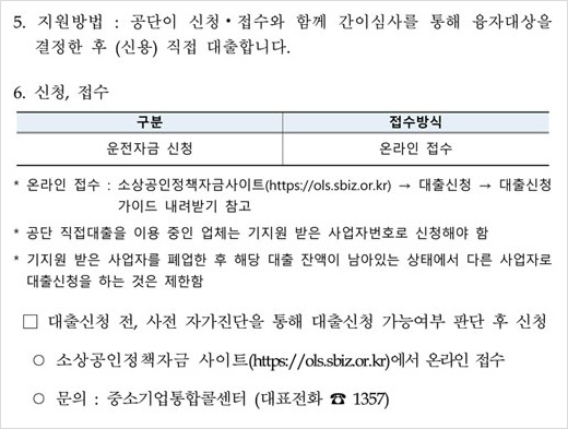 ▶ 신청지원방법 : 온라인 신청 및 간이심사를 통해 융자대상을 결정한 후 (신용)직접 대출.