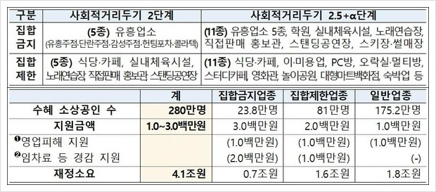 총 280만명의 소상공인에 공통적으로 100만원을 지급하구요. 또한 집합금지와 집합제한 업종엔 각각 200만원과 100만원을 임대료 등 고정비용 경감 지원 명목으로 더 지원해 주는 방식으로 지원이 이뤄진다고 해요.