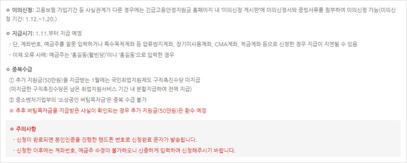 기타 참고사항으로는 기존에 지원금을 지급 받지 않았던 특고 프리랜서분들은 새롭게 신청을 해야 하구요. 신규 신청자를 위한 3차 긴급고용안정지원금 신청 절차 및 지원요건, 신청기간 및 방법은 오는 1월 15일(금)에 노동부 홈페이지를 통해 공고될 예정이라고 해요.