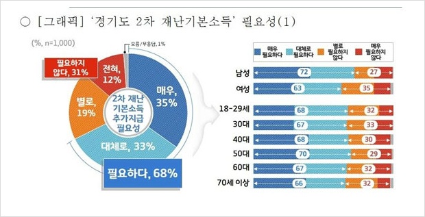 이런 가운데 경기도민 10명 중 7명은 경기도 2차 재난기본소득 지급에 대해 필요하다고 응답했다는 조사결과가 나왔다고 합니다. 경기도가 지난달 5일 도민 1천 명을 대상으로 경기도 2차 재난기본소득 관련 여론조사를 실시한 결과 전 도민에게 2차 경기도 재난기본소득 지급이 '필요하다'는 응답이 68%로 나타났다고 합니다.
