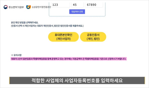 5. 모두 동의했다면 사업자등록번호를 넣고 대상 여부를 조회해 주세요. 유의사항으로는 소상공인 대표자만 신청 가능하구요.
