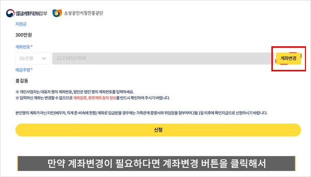기존 새 희망자금 수령 이력이 있다면 계좌번호가 자동으로 뜨는데요. 혹 계좌변경이 필요하다면 계좌변경 버튼을 클릭해 주세요.