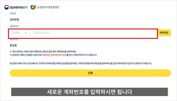 10. 새로운 계좌번호를 입력하면 되는데요. 다만 법인은 법인 명의의 계좌번호를 입력해야 한다고 해요. 입력한 정보가 정확한지 다시 한번 확인해 주세요.