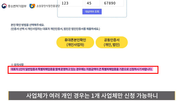 사업체가 여러 개인 경우는 1개 사업체만 신청이 가능하다고 해요.