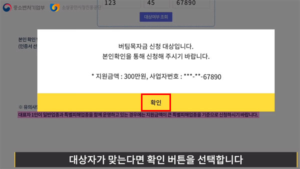 6. 따라서 신청 기준 등을 사전에 꼭 확인하시고 적합한 사업체의 사업자등록번호를 입력해 주셔야 해요. 대상자가 맞다면 확인 버튼을 클릭해주세요.