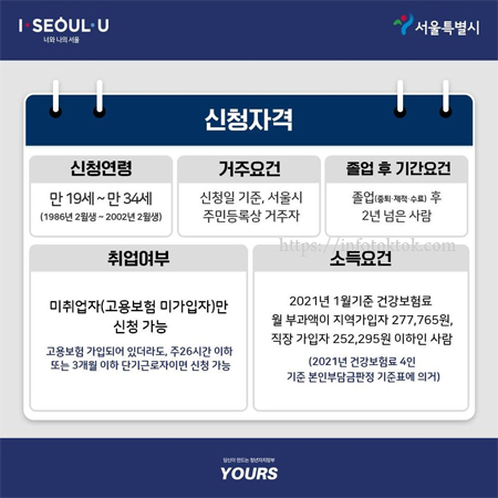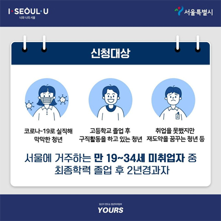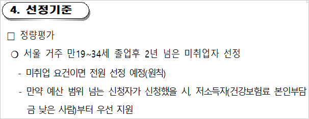▣ 지원대상 : 만19~34세 서울시 거주, 미취업자 중 최종학력 졸업 후 2년 경과자.(단 대학 재학생 및 휴학생은 신청이 불가합니다.)