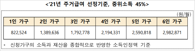 ① 청년 주거급여 신청자격 대상은 주거급여 수급가구(가구의 소득인정액이 중위소득 45%이하 - 보장가구 내 전체 가구원수 기준) 내 만 19세 이상 30세 미만 미혼자녀로서 부모와 거주지를 달리하는 청년입니다. 참고로 2021년 주거급여 선정기준인 중위소득 45%는 다음과 같습니다.
