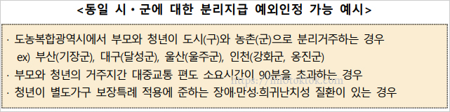 ② 청년 주거급여 분리거주 기준은 부모와 자녀의 주민등록상 주소지가 시․군(광역시의 관할구역 내에 있는 군을 제외)을 달리하는 경우로 하되, 보장기관이 판단 하여 예외 인정이 가능하도록 했습니다. 동일 시군에 대한 분리지급 예외인정 가능 예시는 아래와 같습니다.