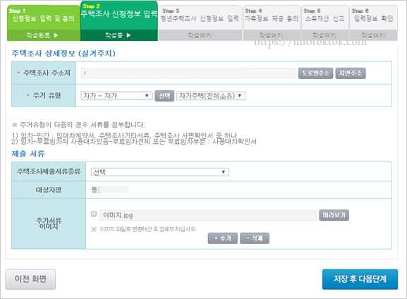 청년 주거급여 주택조사정보를 입력합니다. 제출서류 종류로는 재직증명서, 재학증명서, 학원비 납입증명서, 4대보험가입자 확인서, 가족관계증명서 등이 있습니다. 가족관계증명서는 온라인신청 시 서비스대상자(청년)의 결혼여부 확인이 불가능하므로 첨부해야 합니다.