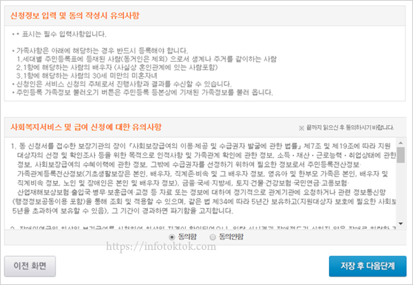 청년 주거급여 신청방법 중 신청인 및 가족구성원 정보를 입력단계입니다. 서비스 선택과 입력정보 동의 절차입니다. 청년 주거급여 분리지급의 보장기관은 부모가 거주하는 시군구이며, 온라인신청서를 행복e음으로 전송 시 관리행정동은 신청인의 거주지이므로 부모가 신청합니다.