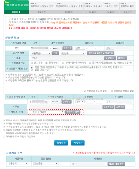 주민등록가족정보 불러오기로 불러오지 않은 가구원은 가족추가 버튼을 클릭해서 정보를 입력합니다. 신청인 외 가족구성원 중 만 19세 이상 30세 미만 일 경우 서비스 선택란이 나타납니다. 신청가능여부 버튼을 클릭 시 주거급여 수급자여부를 확인하며, 주거급여수급자가 아닐 경우 신청서 작성 진행이 불가하다는 메시지 알림이 뜹니다.
