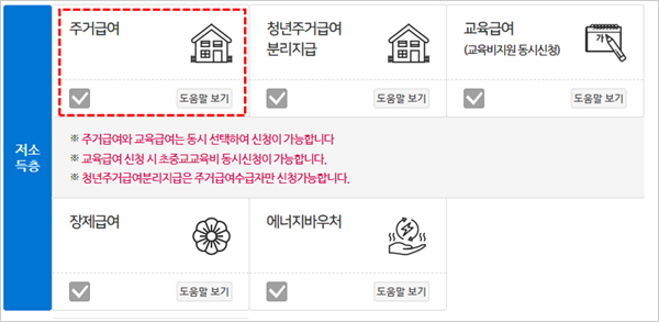 신규 주거급여 신청자는 기존과 동일하게 주거급여 서비스를 선택하여 온라인 신청을 진행합니다.