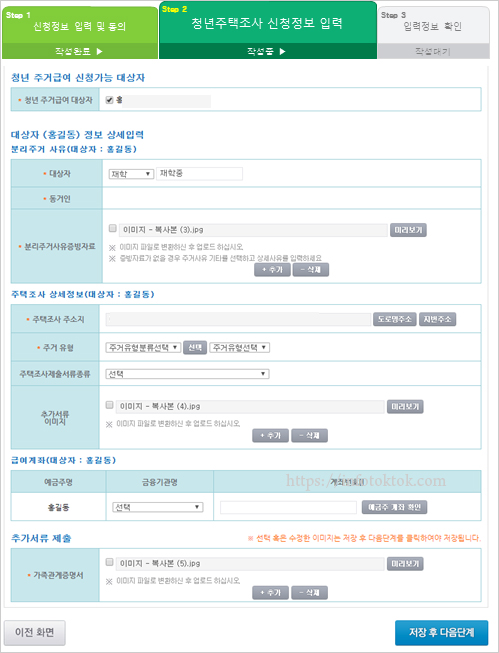 주민등록가족정보 불러오기로 불러오지 않은 가구원은 가족추가버튼을 클릭해서 정보를 입력합니다. 신청인 외 가족구성원 중 만 19세 이상 30세 미만 일 경우 서비스 선택란이 나타납니다. 신청가능여부 버튼 클릭 시 주거급여 수급자여부를 확인하며, 주거급여수급자가 아닐 경우 신청서 작성 불가 메시지 알림이 나타납니다. 주거급여 주택조사정보를 입력 후 저장 후 다음단계 버튼을 클릭하여 청년주거급여 주택조사 정보입력 화면으로 이동합니다.