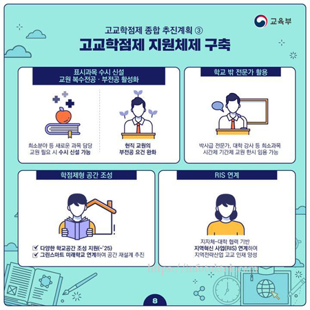 특히 학습의 속도가 다르고 학습의 목표도 다른 학생들을 수직적으로 서열화하는 것은 학생들의 학습 의욕을 저하시킨다고 합니다. 고교학점제는 학생 선택형 교육과정 운영을 통해 다양한 능력과 적성을 가진 학생 개개인의 역량을 최대한 발휘할 수 있도록 지원한다고 합니다.