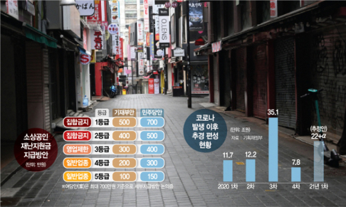 하지만 집합금지 업종과 일반 업종을 매출 감소 폭에 따라 각각 2개 그룹씩 나눠 지원액 등급을 5개로 확대하면 지원금 격차는 훨씬 커지게 된다고 하는데요. 여당이 추진 중인 최대 700만 원 지급 방안이 적용된다고 가정하면 1등급(700만 원)과 5등급(150만 원)의 차이는 최대 550만 원까지 벌어진다고 해요.