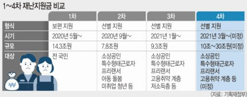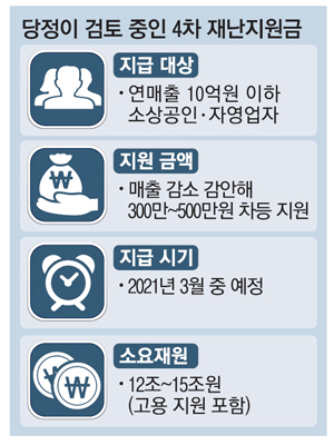 하지만 여당은 국민의 고통을 줄이기 위한 구제책이라고 일축하고 있으며 이번 4차 재난지원금 지급은 단순 위로금이 아닌 피해 업종에 실질적 손실보상이 되게 하겠다는 입장이라고 하네요. 따라서 내달 국회 논의 과정에서 진통이 예상되고 있는 4차 재난지원금 대상 및 4차 재난지원금 금액이라고 합니다.