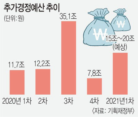 이처럼 4차 재난지원금 등 자영업 지원 방안에 대한 당정간 논의가 급물살을 타고 있는 분위기라고 하는데요. 최대 20조 원가량의 재원을 투입해 1인당 최대 900만 원을 지급하는 방안이 거론되고 있지만 이 정도로 지원규모를 늘리게 되면 올해 안에 나랏빚이 1000조 원을 넘어설 수 있어 재정당국이 난색을 표하고 있다고 해요.