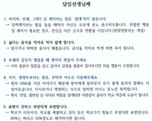 초교조는 학부모 A씨가 후임 담임교사에게 보냈다는 편지도 공개했다. 편지에는 ‘하지마, 안돼, 그만! 등 제지하는 말은 절대하지 말라’, ‘또래와 갈등이 생겼을 때 철저히 편들어 달라’, ‘왕의 DNA를 가진 아이이기 때문에 왕자에게 말하듯이 듣기 좋게 돌려서 말해도 다 알아듣는다’ 는 등의 내용이 포함돼 있다고 합니다.