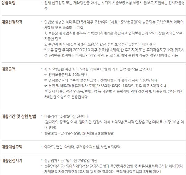 ▶ 대상 주택은 아파트, 연립, 다세대, 주거용오피스텔, 노인복지주택이며 ▶ 한도 금액은 최소 5백만원 이상 최고 5억원 이하로서 아래 ①~ ③ 중 적은 금액이내로 한다고 해요. ① 임차보증금액의 80% 이내, ② 임차물건지의 선순위 설정최고액과 전세대출금의 합계가 시세의 80% 이내, ③ 본인 및 배우자(결혼예정자 포함)가 보유한 주택이 1주택인 경우 최고 3억원 이내라고 해요.