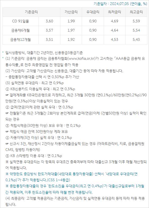 ▶ 국민은행 교직원 신용대출 금리 이자 이율은 2024년 7월 5일 현재 다음과 같다고 합니다. 일시상환방식, 대출기간 2년 미만, 신용등급 3등급 기준에 따른 금리라고 합니다.
