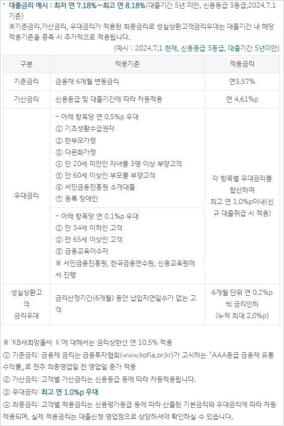 ▶ 국민은행 새희망홀씨 2 대출 금리 이자 이율은 다음과 같다고 합니다. 대출금리 예시 : 최저 연 7.18%∼최고 연 8.18%로서 대출기간 5년 미만, 신용등급 3등급, 2024.7.1일 기준이라고 합니다.