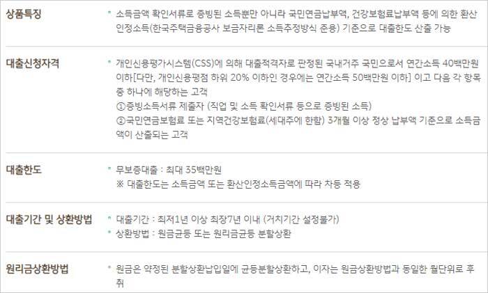 소득금액 확인서류로 증빙된 소득뿐만 아니라 국민연금납부액, 건강보험료납부액 등에 의한 환산인정소득(한국주택금융공사 보금자리론 소득추정방식 준용) 기준으로 대출한도 산출이 가능한 국민은행 새희망홀씨2 대출 신청대상 자격조건 은 다음과 같다고 합니다.