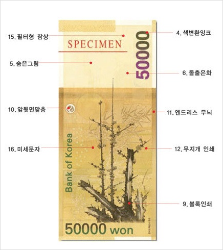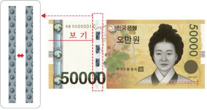 5만원권 위조지폐 감별법으로 뒷면 오른쪽 액면숫자("50000")에 특수잉크를 사용하여 이 숫자의 색상이 은행권의 기울기에 따라 자홍색(magenta)에서 녹색(green) 또는 녹색에서 자홍색으로 변한다고 해요.