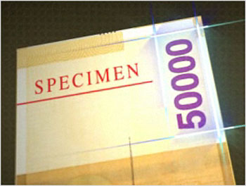 용지의 특정 부위에 주변과의 두께 차이를 극대화한 숨은그림(watermark)의 일종으로 육안으로 보거나 빛에 비추어 보면 오각형 무늬와 그 안에 숫자 '5'가 있다고 해요.