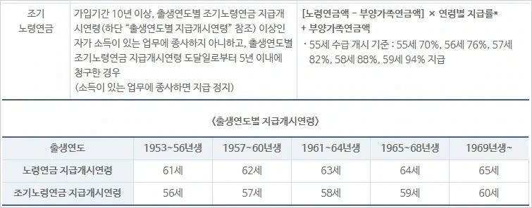 조기노령연금은 국민연금 가입 기간이 10년(120개월) 이상이고, 일정 수준 이하의 월평균 소득이 있을 때 신청할 수 있는 조건이 있습니다. (기준 금액은 매년 변동)