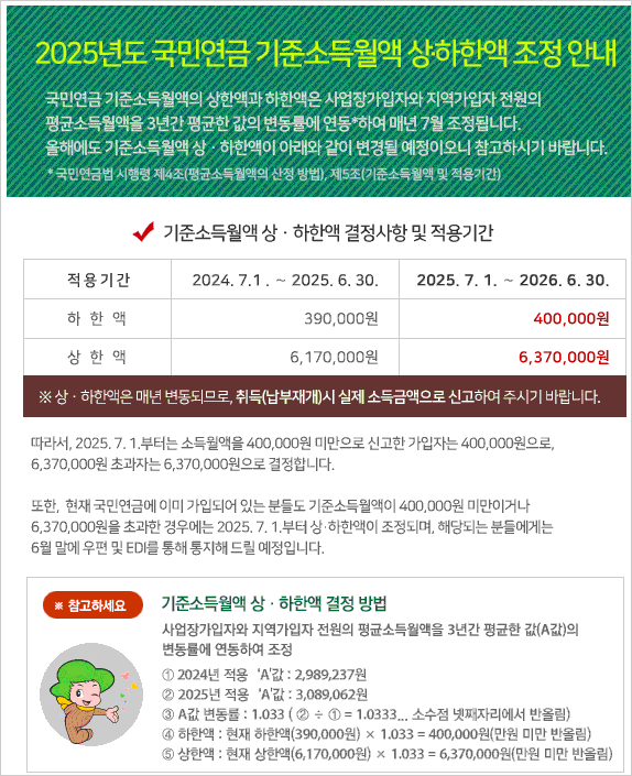 2025년도 국민연금 기준소득월액 상한액 및 하한액 조정 안내