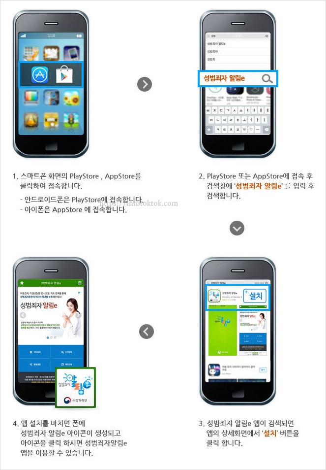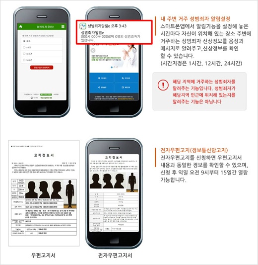 이에 따라 성범죄자가 동네로 이사를 오거나 다른 곳으로 주거지를 옮길 때 스마트폰을 통해 쉽게 정보를 확인할 수 있도록 지난 11월부터 성범죄자의 이름, 나이, 사진, 주소 등 신상정보를 모바일로도 고지하는 모바일 고지제도가 도입되었는데요. 다만 올해 말까지는 모바일 고지 시범 운영기간으로 우편과 모바일이 병행 실시되며 내년부터는 모바일 고지서 미열람자에게만 우편 고지서가 발송될 예정이라고 합니다.