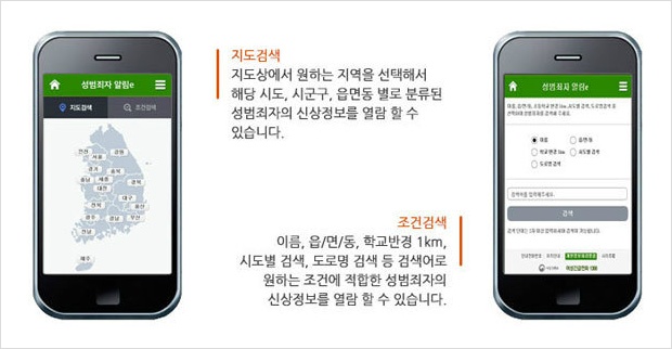 실명인증만 거치면 누구나 이들 성범죄자의 이름과 나이, 주소, 실제 거주지, 사진, 범행 내용 등을 인터넷에서 열람할 수 있다고 합니다. 실명인증은 공인인증서, 아이핀, 휴대폰, 주민등록번호 등으로 할 수 있다고 합니다.