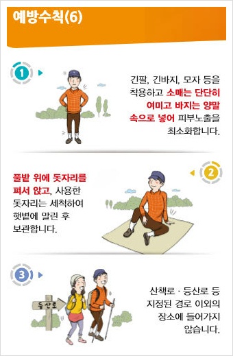 1. 긴팔, 긴바지, 모자 등을 착용하고 소매는 단단히 여미고 바지는 양말 속으로 넣어 피부노출을 최소화하는 것이 필요해요.