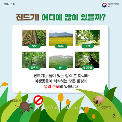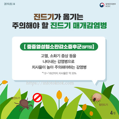 야외 활동이 늘어나고 있는 때지만 살인진드기라 불리는 중증 열성 혈소판 감소 증후군(SFTS) 증상으로 인한 피해가 커지고 있는 시기이기도 해 살인진드기인 야생진드기에 대한 각별한 주의가 필요할 것 같습니다. 이상은 중증 열성 혈소판 감소 증후군(SFTS) 증상을 일으키는 살인진드기 물린사진 및 살인진드기 예방법 및 퇴치법에 대한 정보였습니다. 주의와 예방으로 늘 건강하고 활기찬 시간 보내시기 바랍니다.