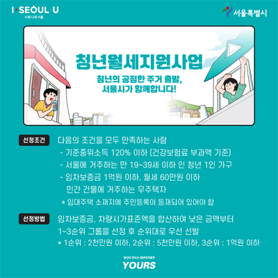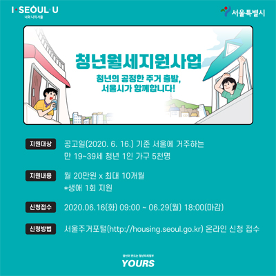 서울시 청년 월세 지원 사업은 높은 주거비로 고통 완화 및 받고 있으며 독립생활 출발선에 선 청년 1인가구의 주거안정을 지원하는 사업이라고 합니다. 지난해 청년들이 직접 제안하고 서울시 청년자율예산제를 통해 올해부터 본격적으로 시행되는 사업이라고 합니다. 올해 총 5000명을 선정해 월세 20만원을 최장 10개월간 지원하기로 했다고 합니다.