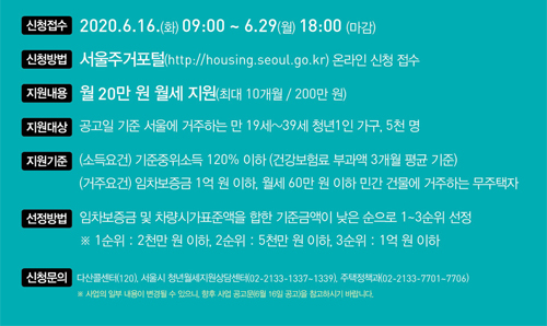 참고로 자세한 문의는 '1대1 상담' 이용 또는 전화 다산콜센터(120), 청년월세지원상담센터(02-2133-1337~9), 주택정책과(02-2133-7702 ~7706)로 연락하면 된다고 합니다. 이상은 6월 16일부터 29일까지 신청을 받으며 월세 20만원을 최장 10개월간 지원을 받는 서울 청년월세 지원 신청 사업 및 자격대상, 신청방법에 대한 간단 정보였습니다. 참고하셨으면 좋겠어요.