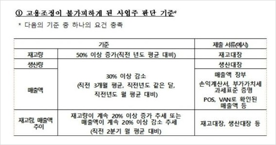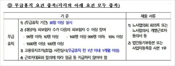 A. 경영 악화와 법령상 무급휴직 조건 두 가지를 갖춰야 합니다. 경영 악화는 재고가 전년 평균 대비 절반 이상 늘었거나 생산량·매출액이 기준(전년 동기, 전년 평균, 직전 3개월 평균)보다 30% 이상 줄어든 경우을 말합니다. 재고·생산 대장으로 증명할 수 있으면 된다고 합니다.