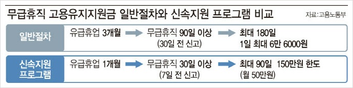 A. 이전에도 무급휴직자에 대한 지원 대책이 있었습니다. 하지만 기존에는 3개월 이상의 유급휴업이 조건이 있어 코로나 사태로 인해 타격을 받은 사용자의 부담이 컸다고 합니다. 이번에 실시되는 무급휴직 신속지원 프로그램은 유급휴업 조건을 1개월로 단축하는 것이 핵심이라고 합니다. 다만 지원액은 최대 90일간 150만 원으로 최대 180일간 일 6만6,000원을 지원하는 기존 제도보다는 적다고 합니다.