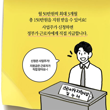 고용노동부는 지난 14일 무급휴직자 150만원 지원을 담은 '무급휴직 신속지원 프로그램'을 7월 1일 모든 업종으로 확대 실시한다고 밝혔습니다. 무급휴직 신속지원 프로그램은 정부가 지난 4월 코로나19 사태에 대응해 발표한 '고용안정 특별대책' 사업 중 하나라고 합니다. 1개월 유급휴직 후 30일 이상 무급휴직에 들어간 사업장의 노동자에게 월 50만원씩 최대 3개월간 지원하는 것을 골자로 하고 있죠.