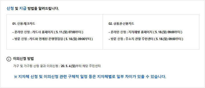 ▶ 긴급재난지원금 신청은 현금, 신용 및 체크카드 신청과 지역사랑상품권 및 선불카드 형태로 진행됩니다.