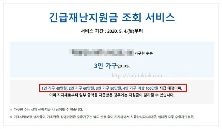 대상 가구원수 및 긴급재난지원금 지급액을 확인할 수 있습니다.