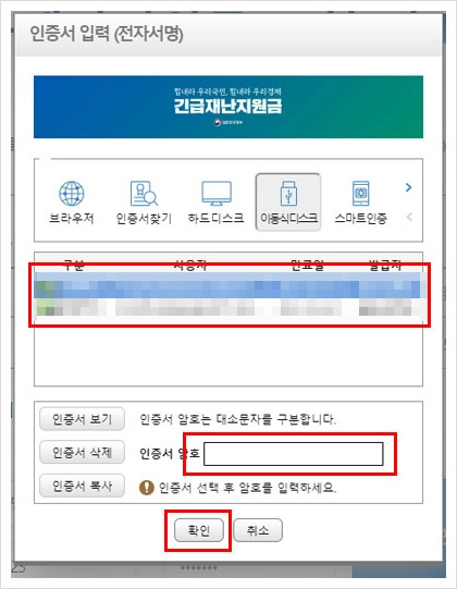 인증서 암호를 입력한 후에