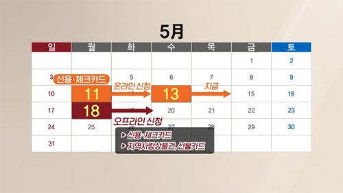 ▶ 11일부터 각 카드사 홈페이지에 접속해 온라인으로 신청할 수 있습니다. 단 세대주 본인 명의의 신용 및 체크카드로 신청해야 합니다.