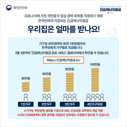 ▶ 가구당 40만 원부터 최대 100만 원까지 전 국민에게 가구별로 지급되죠.