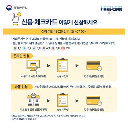 ▶ 신용카드 및 체크카드로 받는 긴급재난지원금은 세대주가 본인 명의 카드로 신청해야 하죠. 방문 신청도 본인이 직접 해야 하죠.